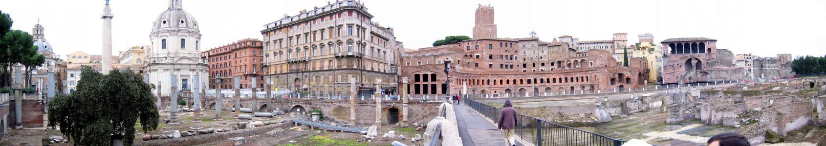 vista panorâmica percorre as ruínas Forum de Trajano e as ruas adjacentes.